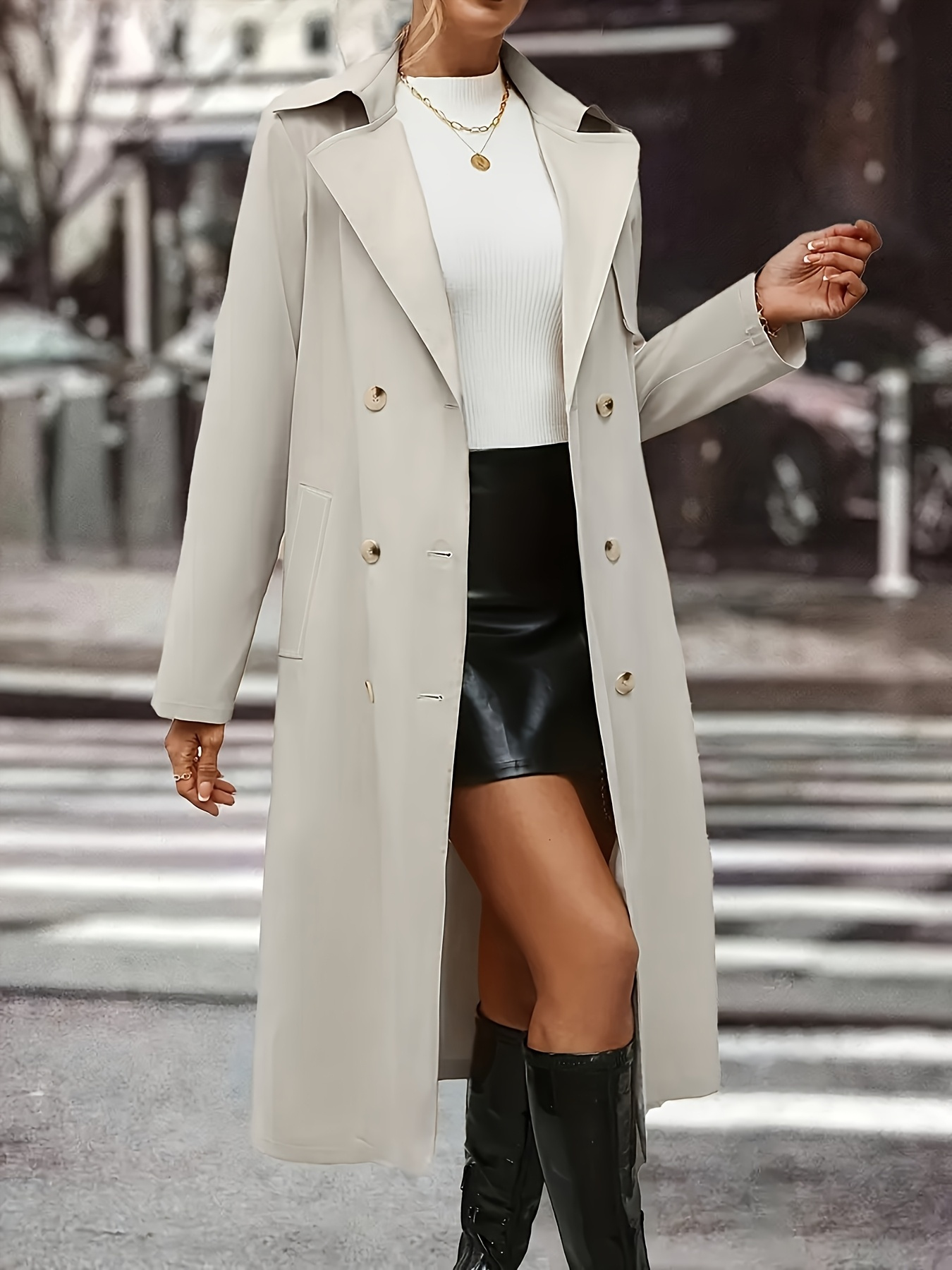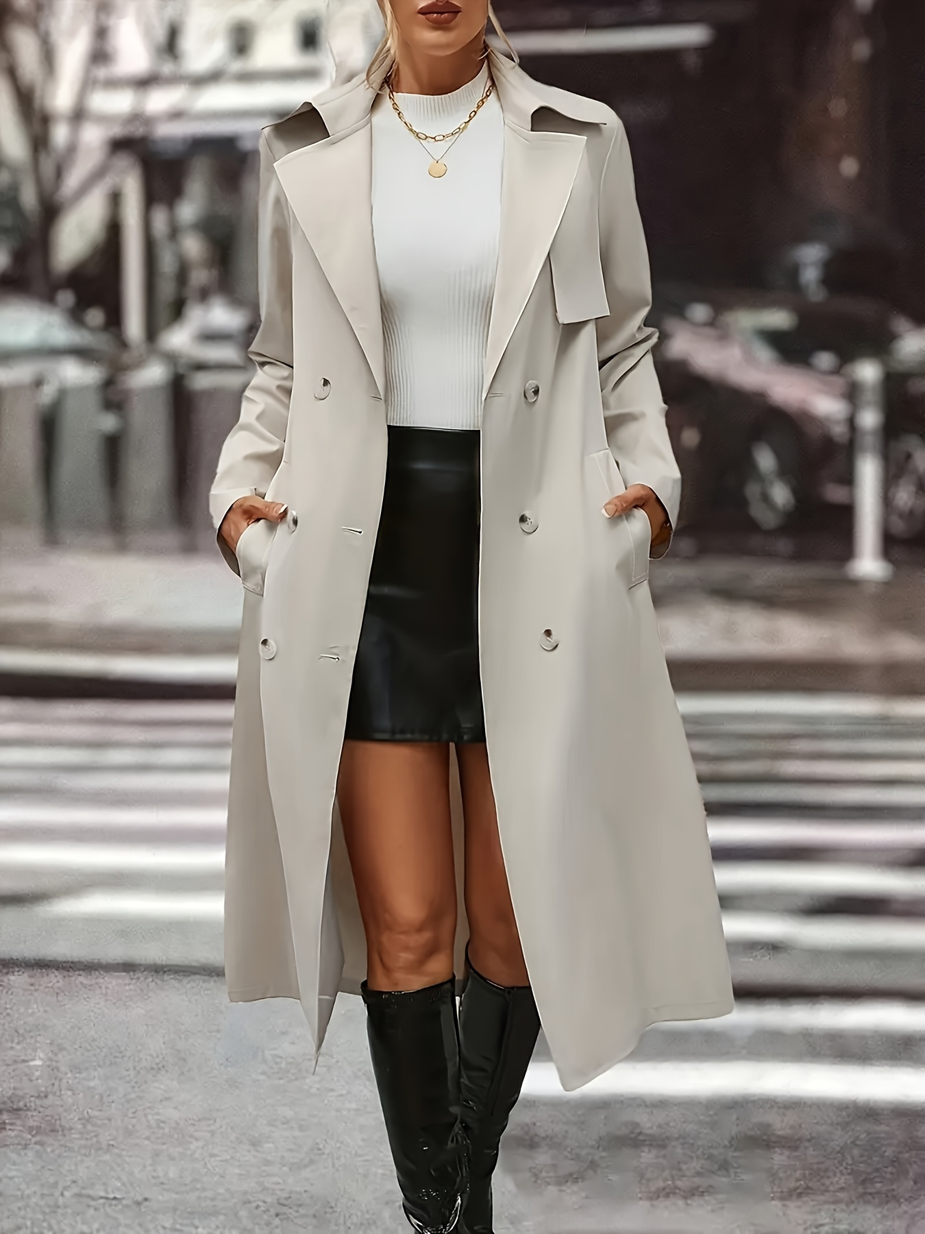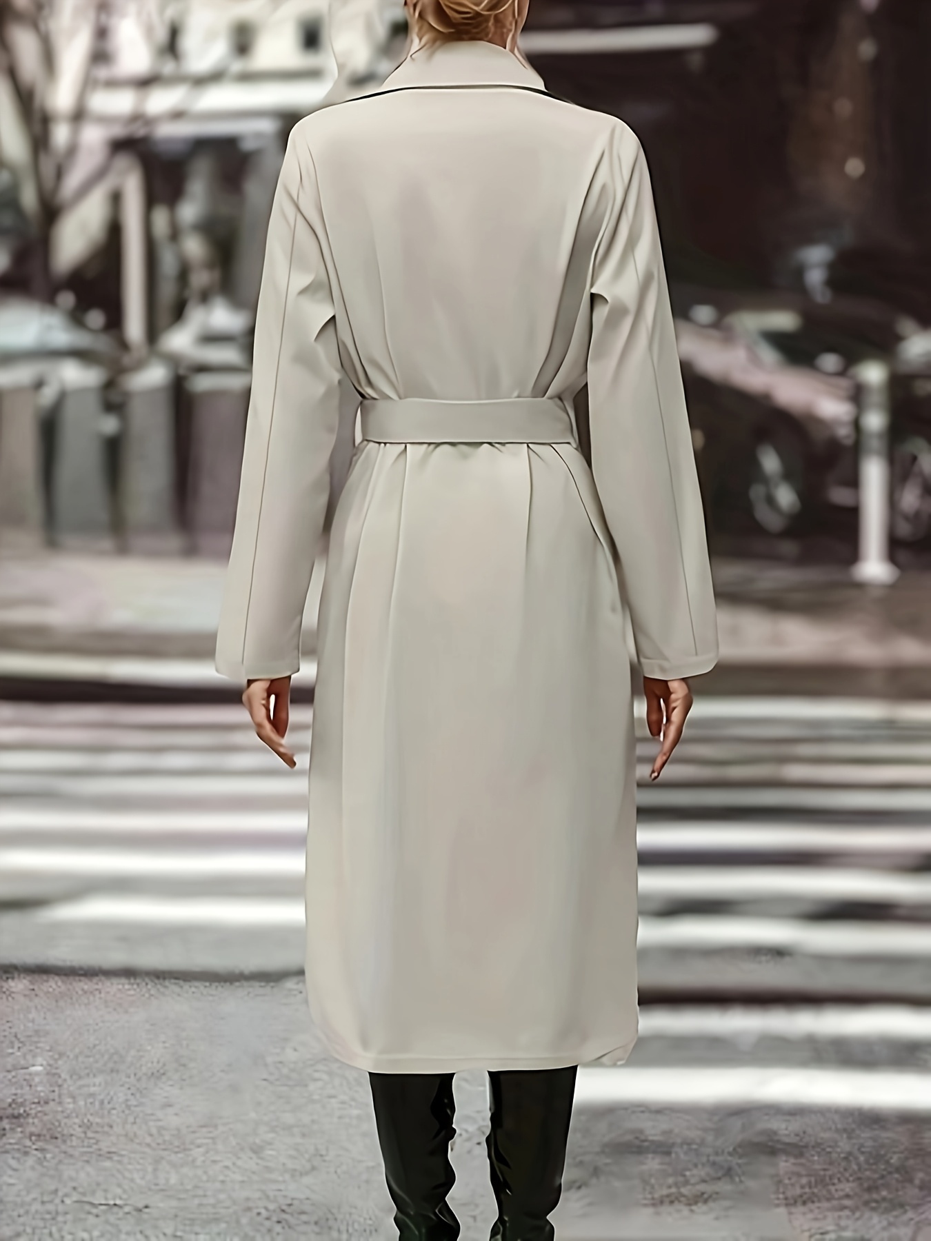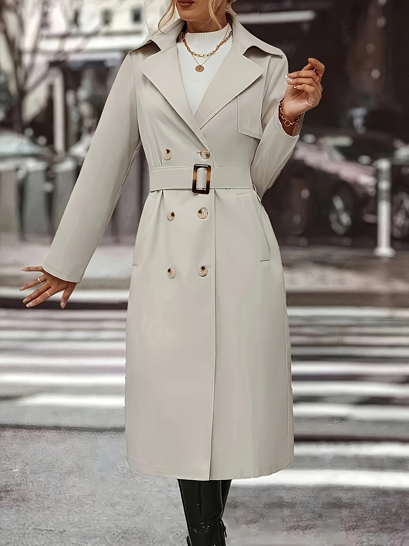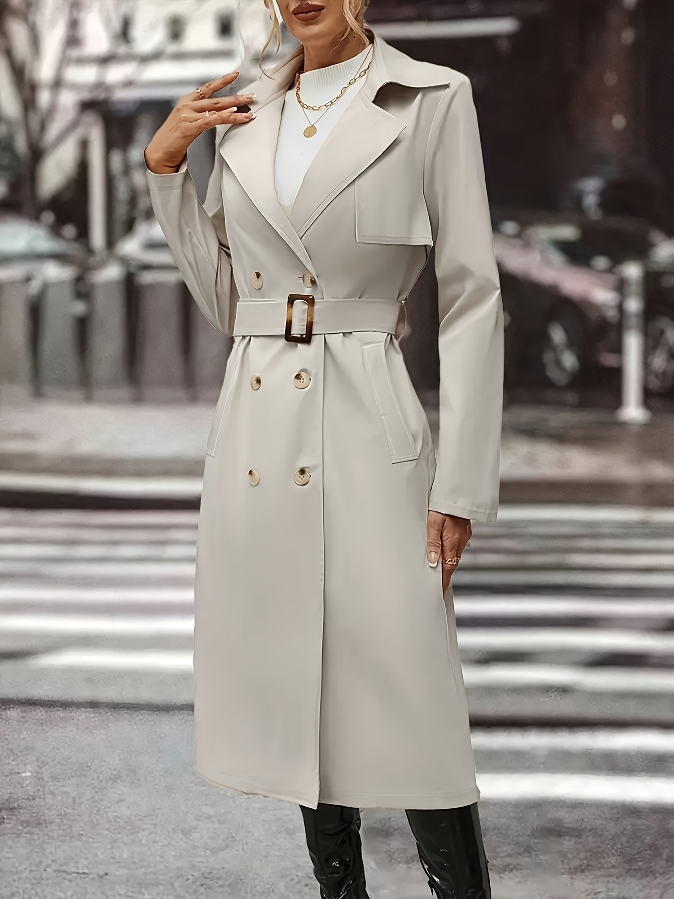 Women's Plus Size Long Coat - Elegant Belted Button Front Closure, Beige/Classic Colors Non-Stretch Jacket for Fall/Spring, Office, Casual & Formal Events - H-Line Silhouette Outerwear