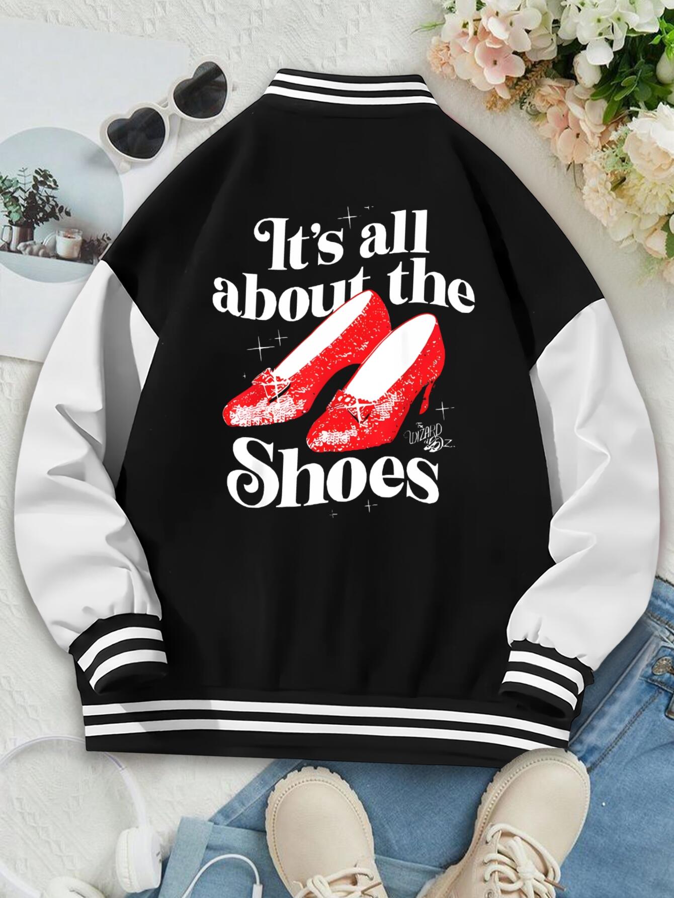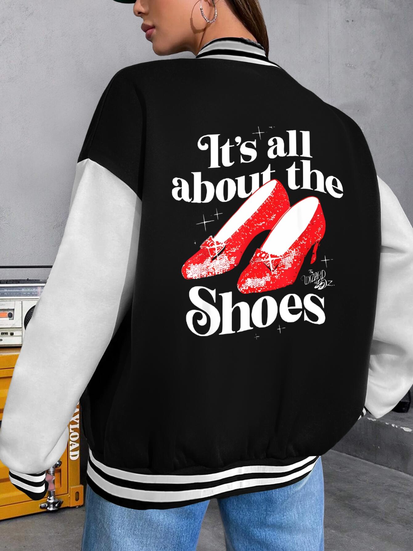Women's Wizard of Oz Ruby Slippers & Dorothy's Back Print Jacket - Plus Size Friendly Black & White Two-Tone Sleeves, Red Glitter Iconic Slippers Design, Casual Winter Outerwear for Halloween Costumes, Parties & Casual Attire -