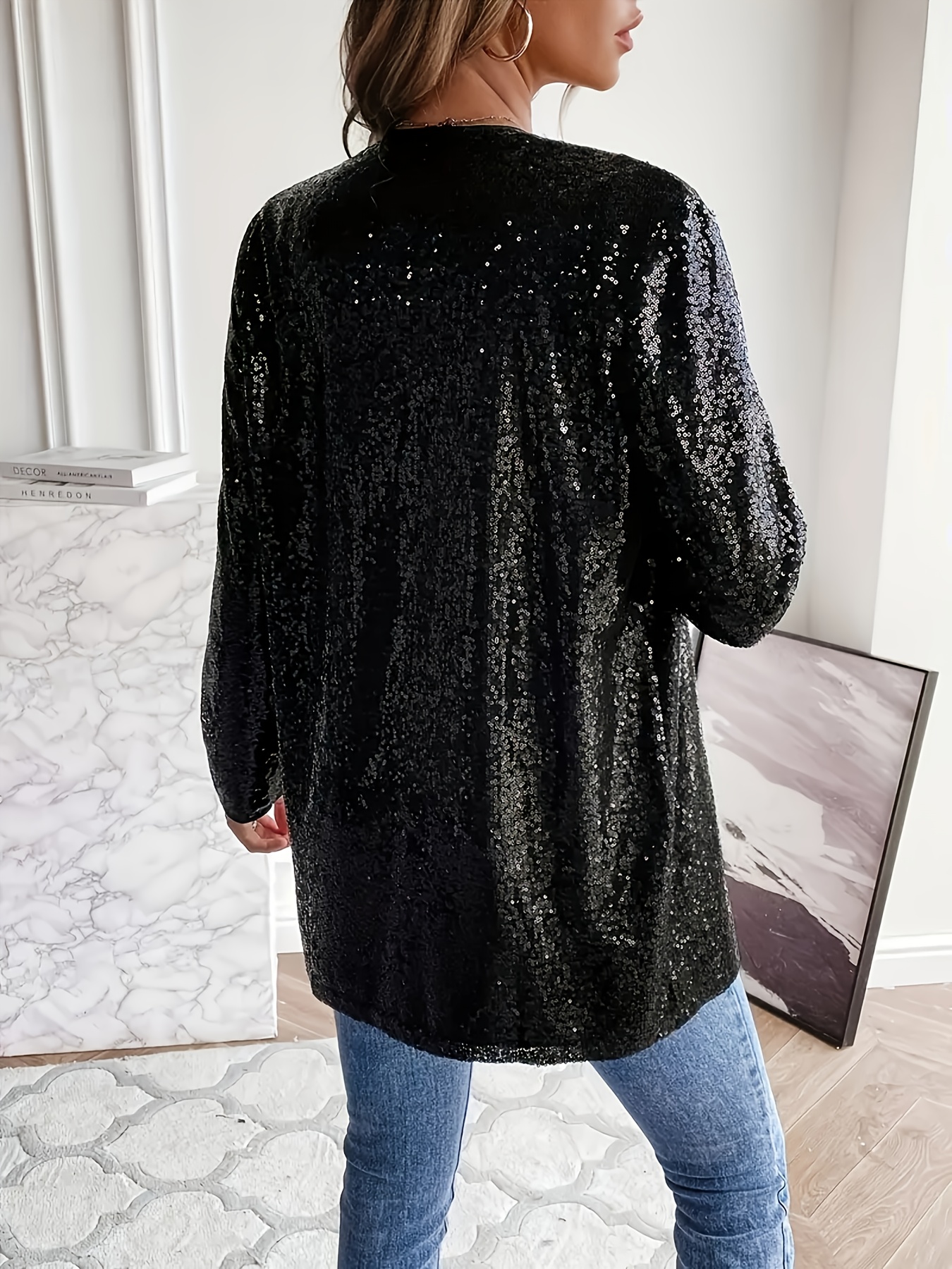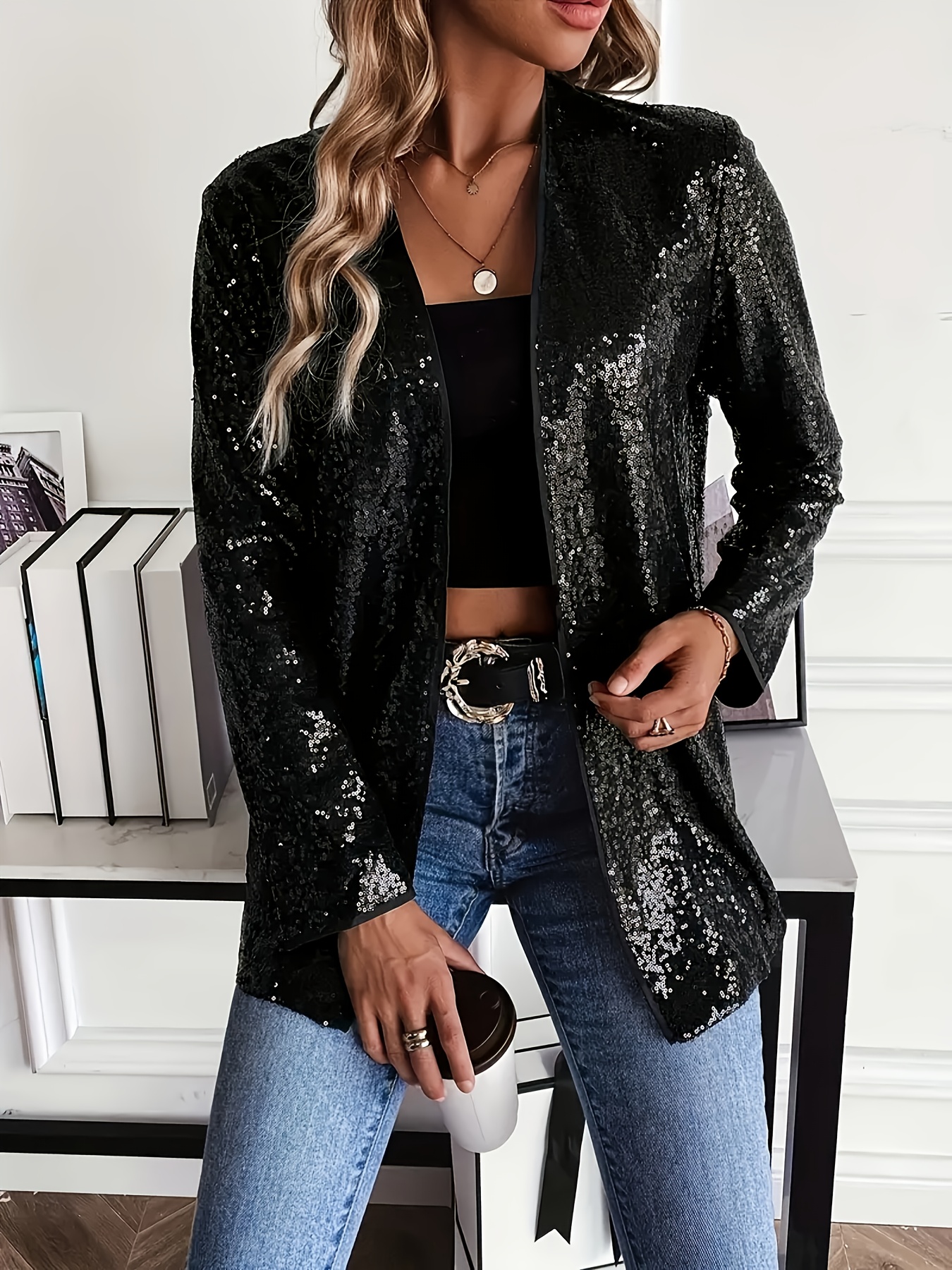 1pc Elegant Plus Size Sequin Long Sleeve Blazer for Women - Casual Open Front Polyester Jacket with Shimmering Detail, Knitted Fabric, Versatile for All Seasons