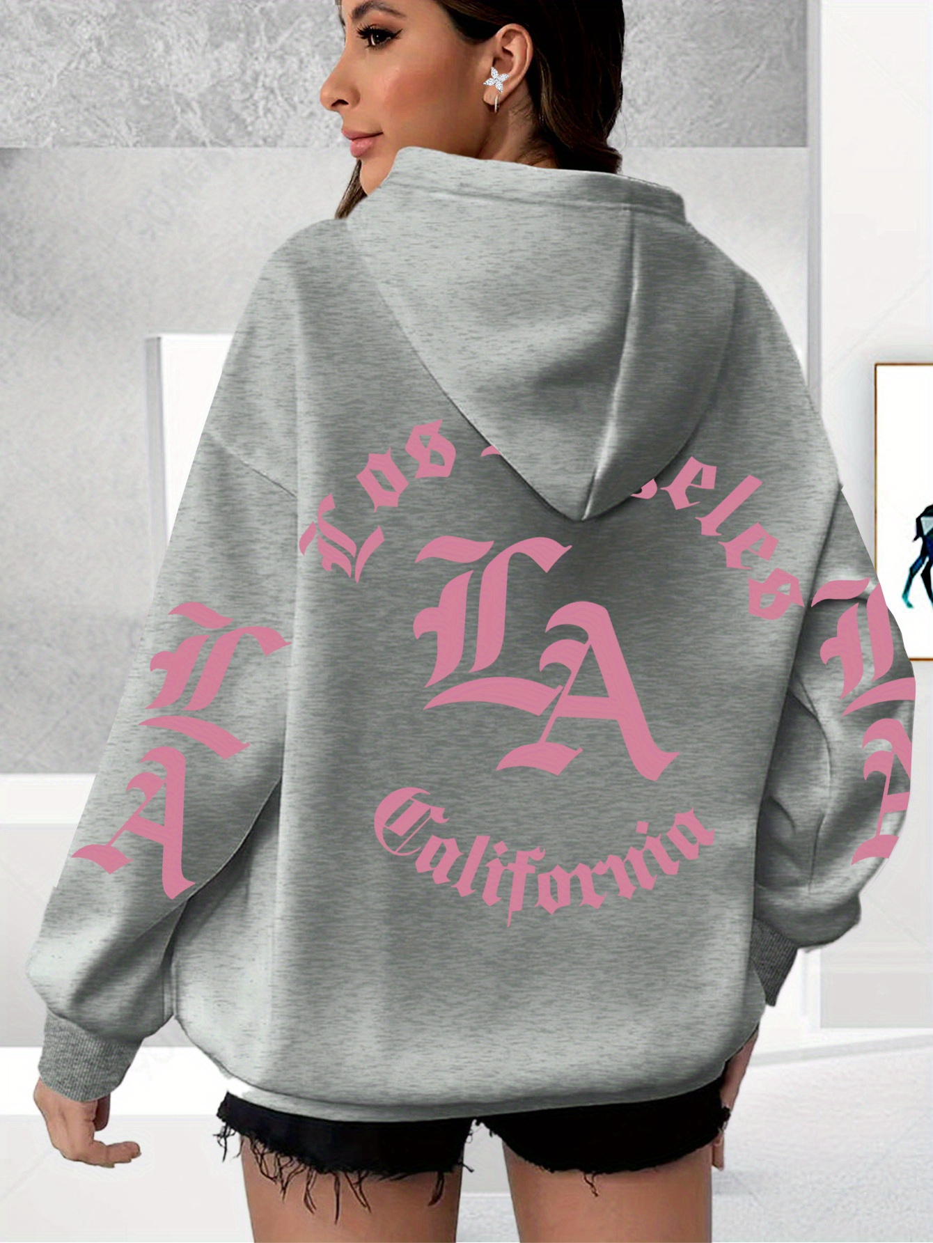 Los Angeles Letter Print Casual Hooded Sweatshirt - Long Sleeves Oversized Hooded Sweatshirt with Popular Extension
