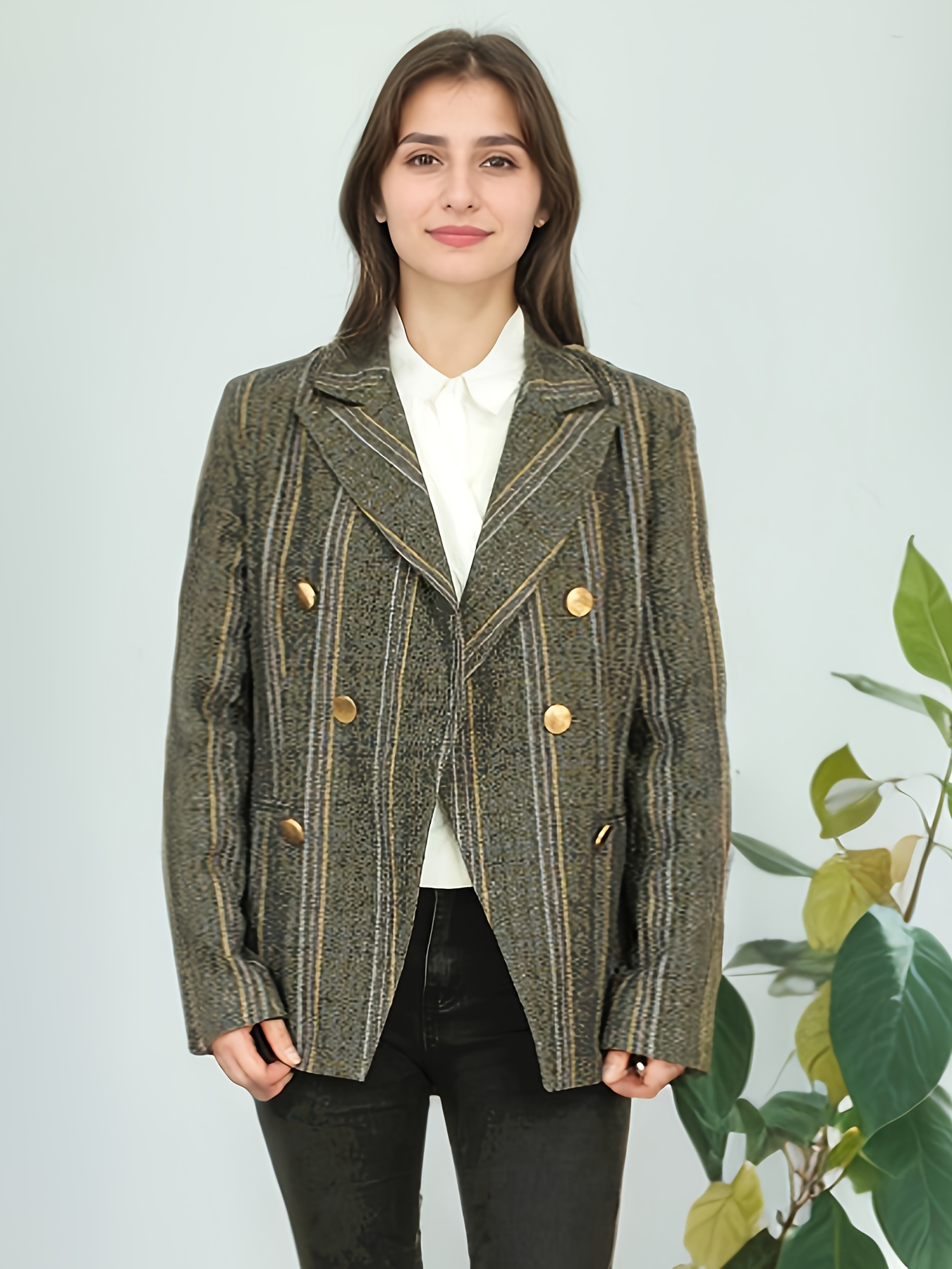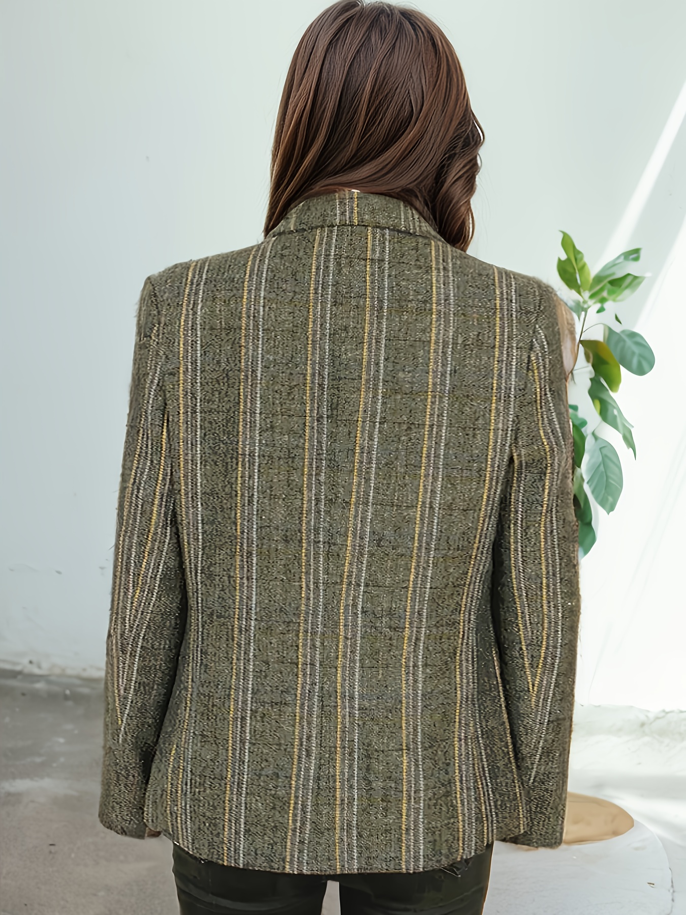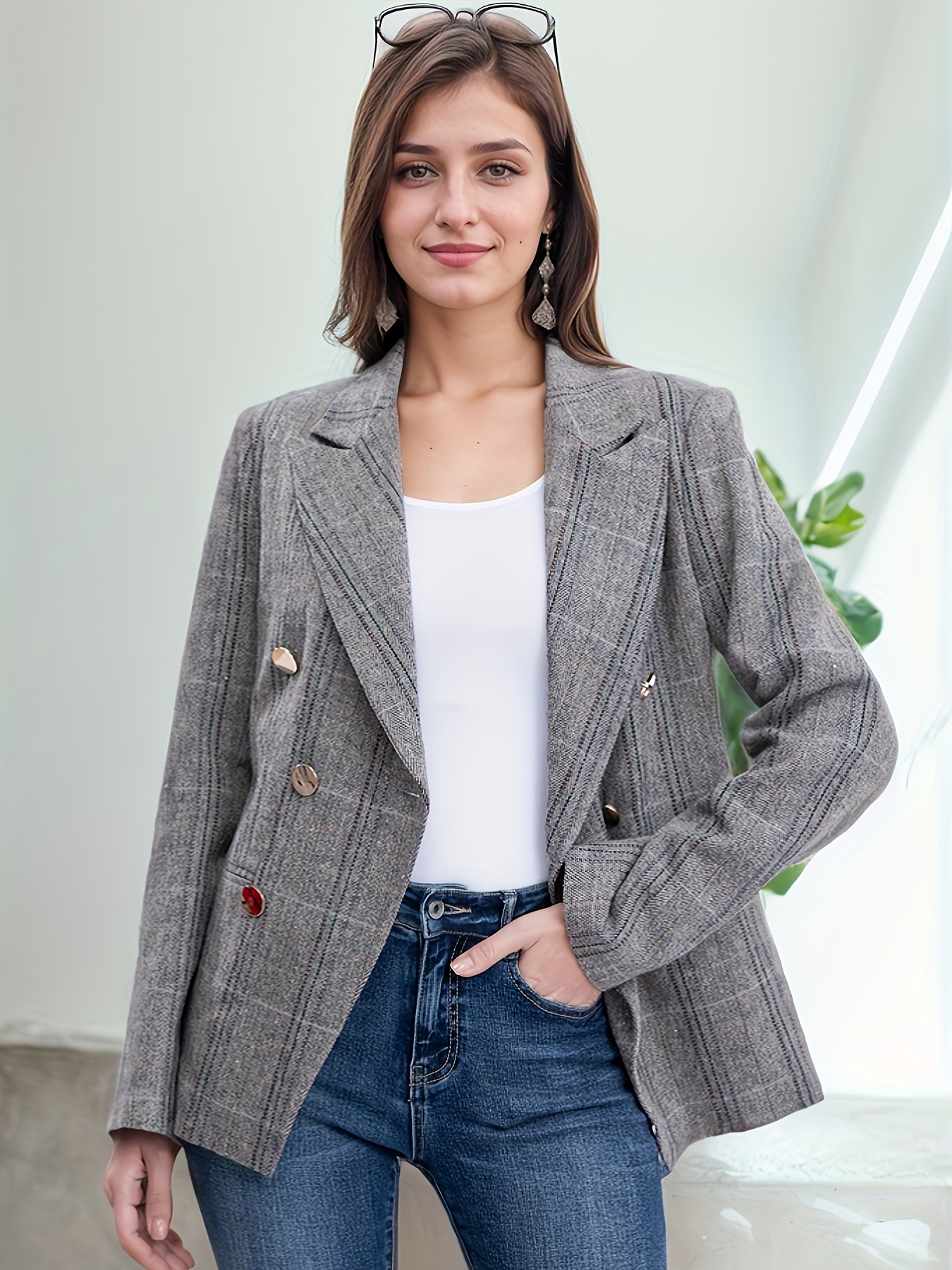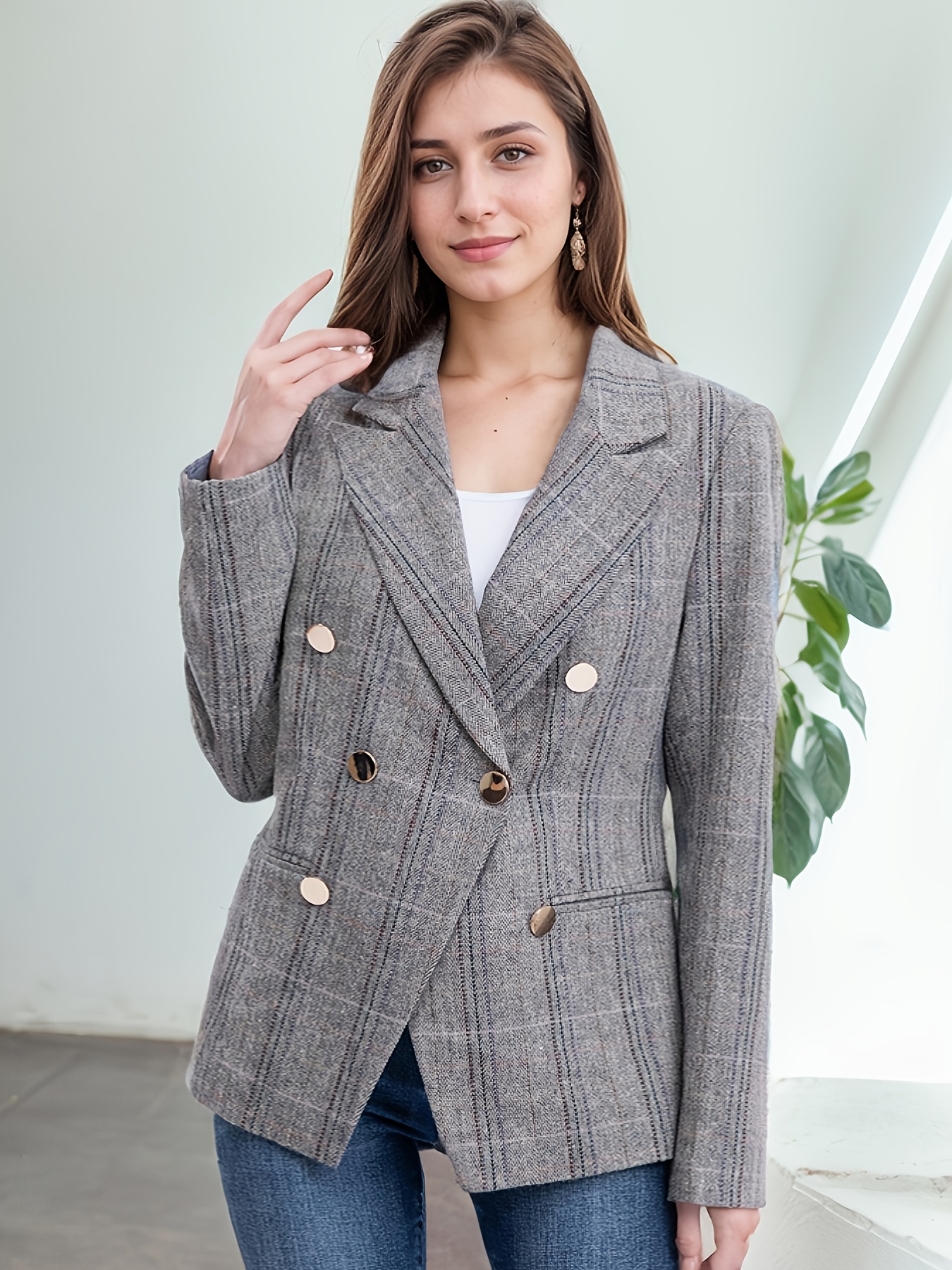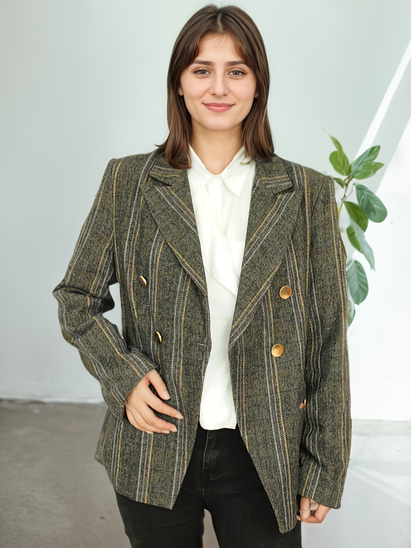 Elegant Plus Size Double-Breasted Blazer - Chic Plaid, Long Sleeve Suit Jacket for Women, Machine Washable