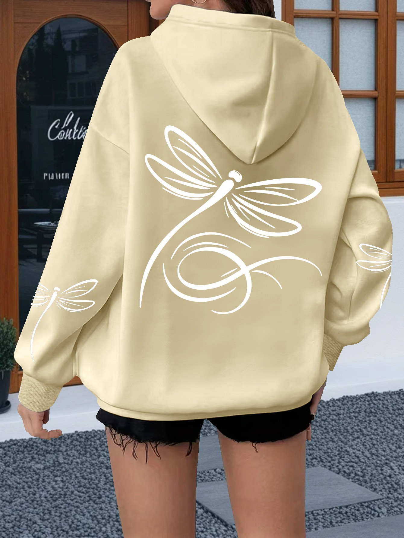 Plus Size, Women's Oversized White Dragonfly Print Hooded Sweatshirt - Long Sleeve Casual Pullover with Drawstring Hood & Kangaroo Pocket, Plus Size All-Season Comfort, Elegant White Sweater for Casual Attire, Machine Washable, Relaxed Fit with Stylish Dragonfly Back Print, Soft Fabric for Layering, Chic and Versatile Women's Fashion