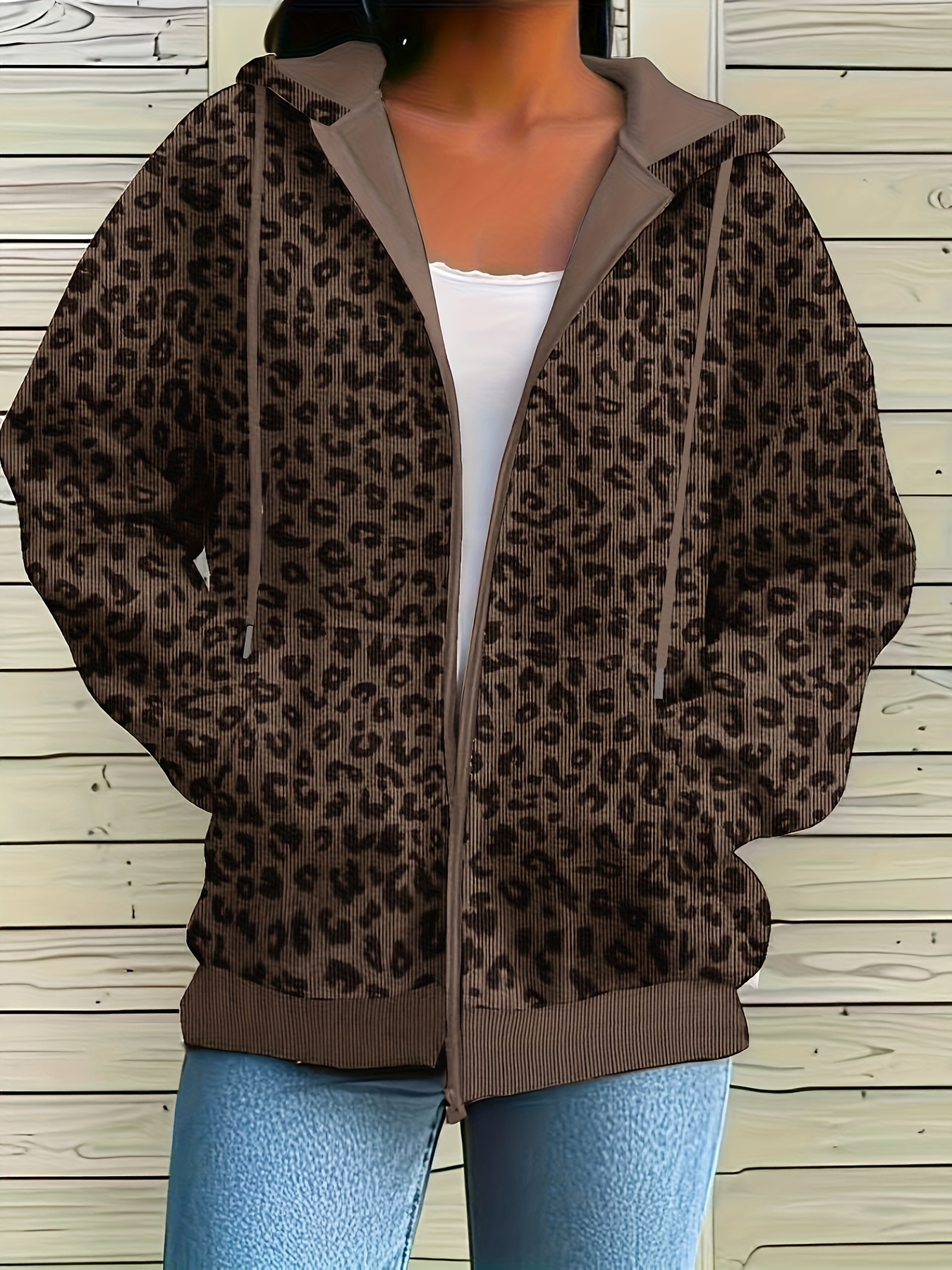 Plus Size - Women'S Plus Size Hooded Sweatshirt - Brown Leopard Print Zip-Up Jacket with Front Pockets, Long Sleeve Casual Outerwear for Everyday & Formal Outfits, Spring/fall Fashion, Spring Outerwear, Stylish Hoodie